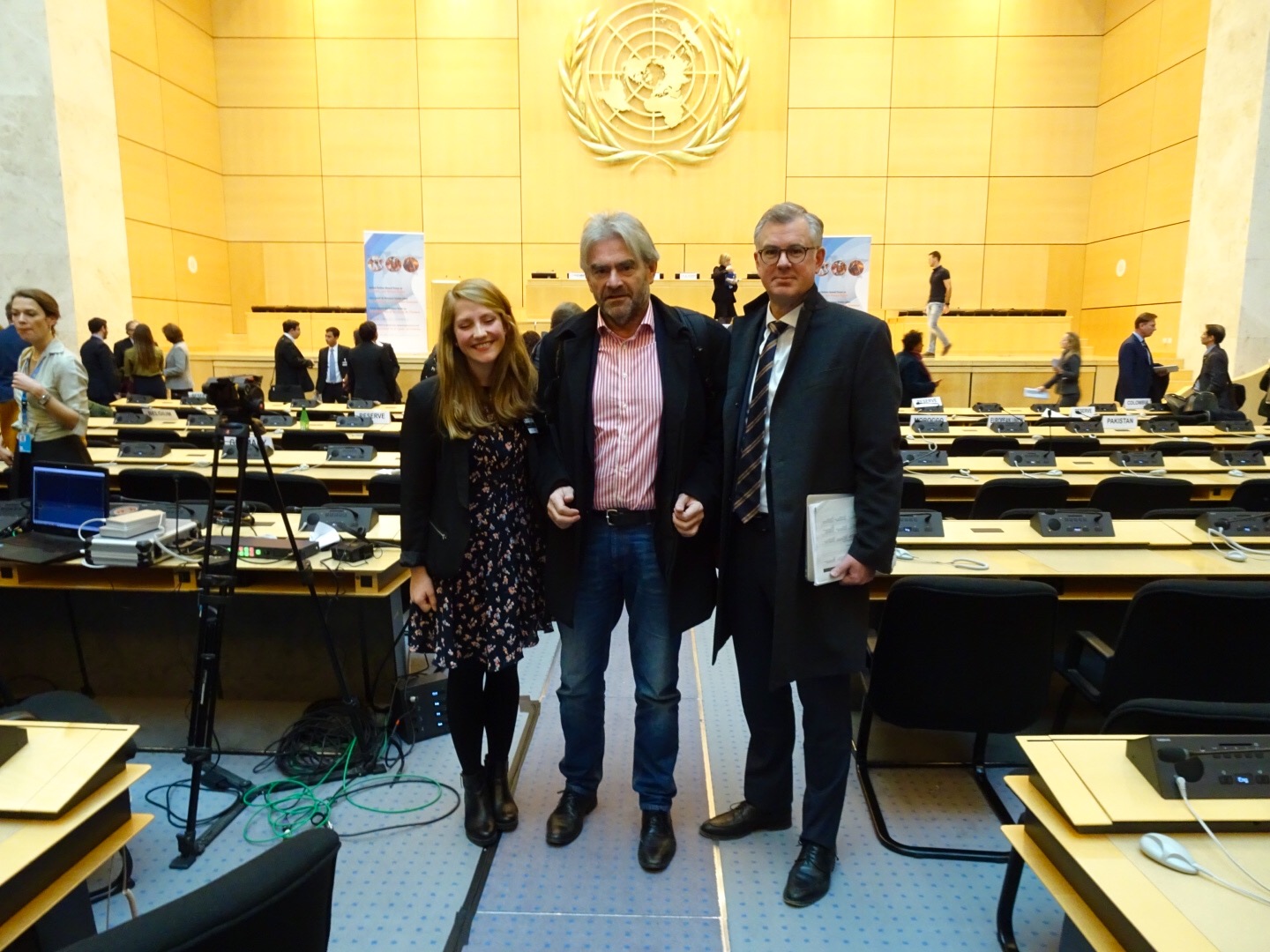 Tre personer står samlet i en sal. Det er flere personer som er bak dem.
